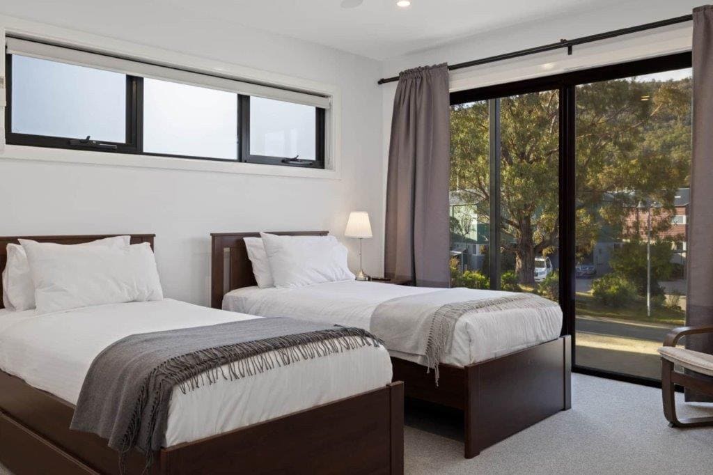 On the lower floor, you’ll find the main bedroom with a queen-sized bed, built-in wardrobes, a smart TV, and a private ensuite with a shower. The second bedroom features two single beds, a smart TV, and its own ensuite, making this home perfect for families or groups. A laundry room with a washer/dryer combo adds convenience for longer stays.