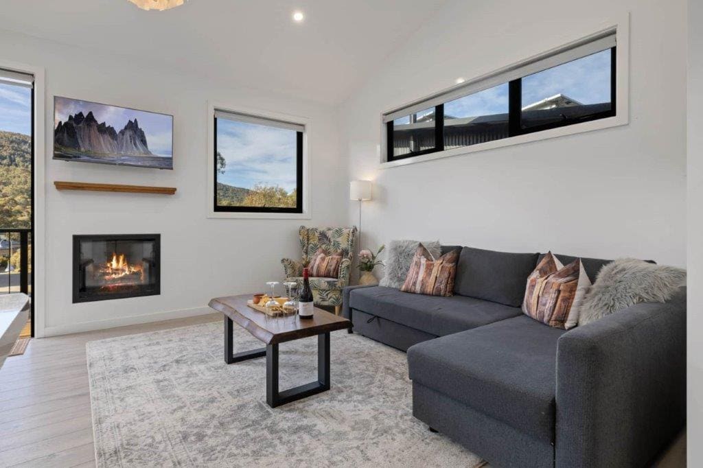 Step into the bright and spacious open-plan living area on the top floor. The fully equipped kitchen features a large fridge, gas cooktop, oven, and dishwasher, making it easy to prepare meals for family and friends. Overlooking the sun-filled lounge, the kitchen flows into a warm, inviting space complete with a gas fireplace, a smart TV, and breathtaking views of the lake. Open the glass doors to the north-facing balcony, where you can soak up the sunshine and unwind with your morning coffee or evening drink, enjoying the serene mountain air.