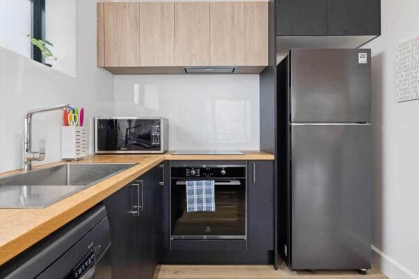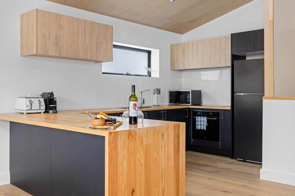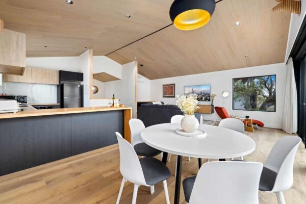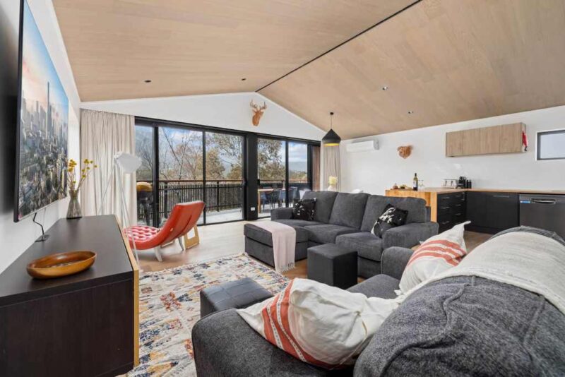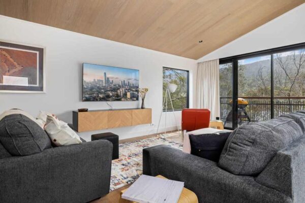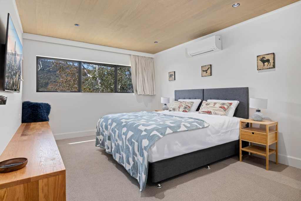 The top level features an open-plan, north-facing living area with huge windows, bringing the outside in. Relax on the super comfy couch and enjoy entertainment on the massive smart TV. Reverse-cycle air conditioning keeps the temperature just right, no matter the season.