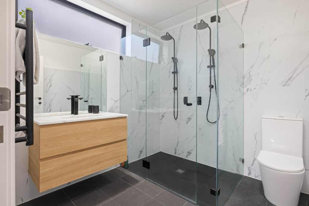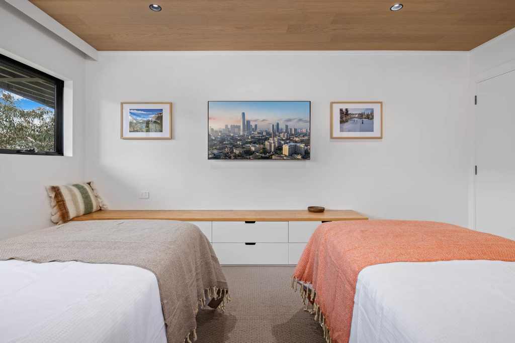 The second bedroom offers two single beds, reverse-cycle air conditioning, a north-facing view, and a private ensuite with the same luxurious features. It’s the ideal space for friends or family, ensuring everyone’s comfort and privacy.
