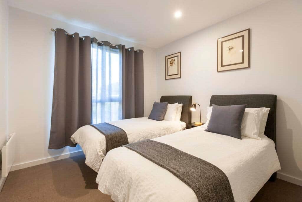 The sleeping quarters are separated from living spaces, with the main bedroom including a King-sized bed, large ensuite bathroom with rainfall showerhead, stunning woodgrain tiles, marble vanity, heated towel rail and underfloor heating. The light-filled second bedroom with twin single beds offers views onto Crackenback Range, and the main bathroom has a deep bath, separate shower, heated towel rail and underfloor heating.