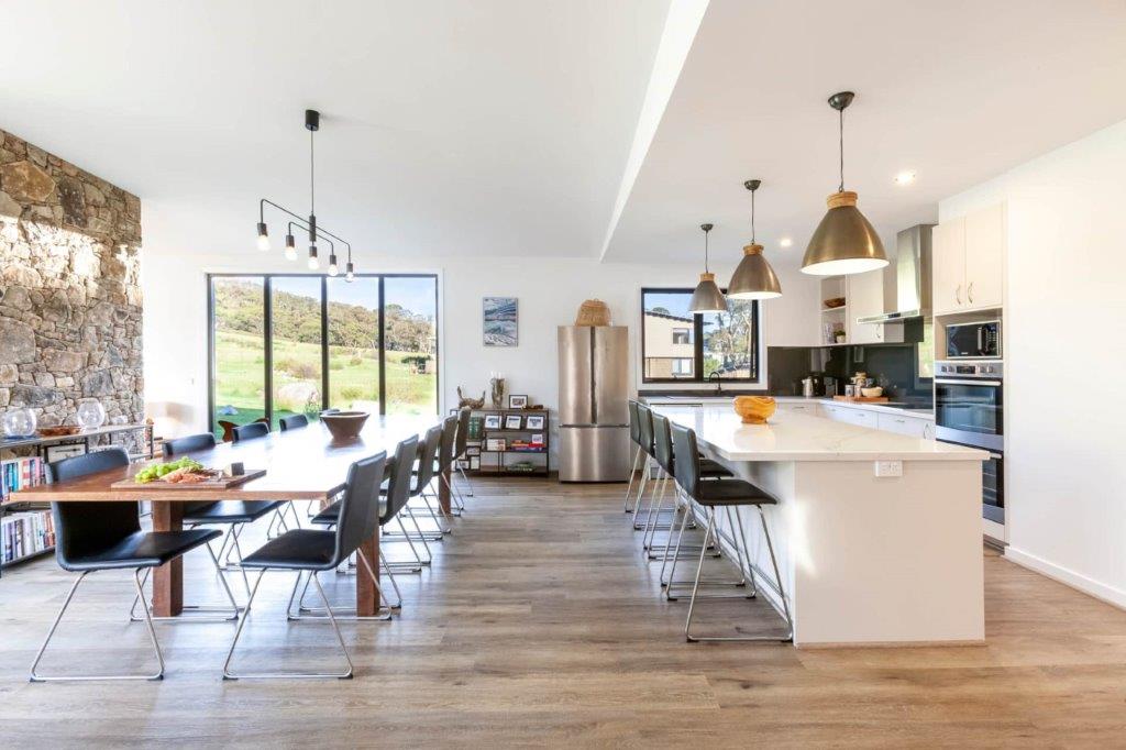 The large, modern entertainer’s kitchen with marble benchtop and ample storage flows into the dinning area with huge 10-seater dining table. This open plan design provides a further connection between the dining area and the relaxed lounge area. In the lounge area there’s a large smart TV mounted on a beautiful rockwork fireplace^ with access to cable and free-to-air channels, and Netflix and Stan. The floor to ceiling windows in the living spaces offer 270-degree immersion in the natural surrounds.