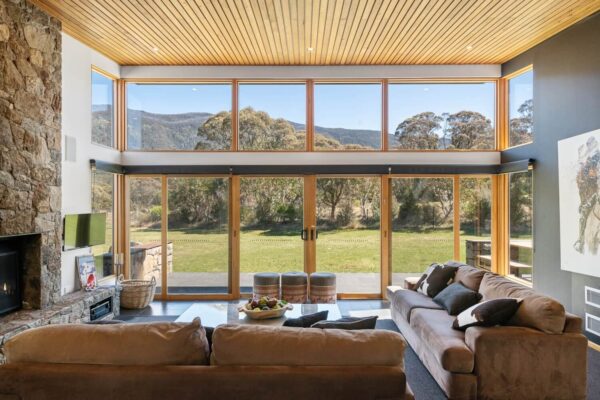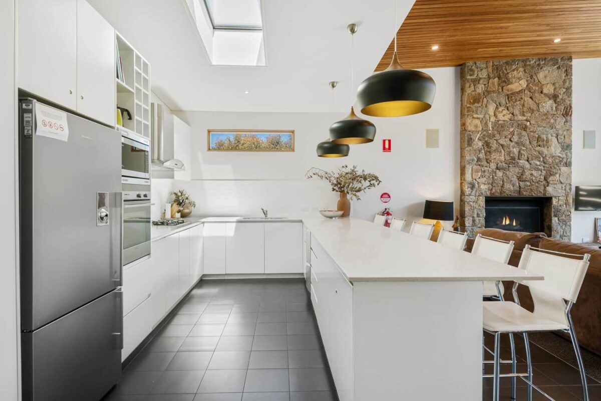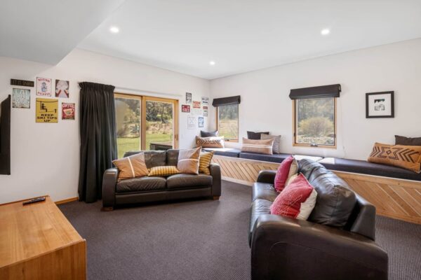 Step into the expansive open-plan living area, bathed in natural light thanks to the chalet’s smart, passive solar design. A huge stone fireplace is the heart of the lounge, with a raked timber feature ceiling offers a cosy ambiance to unwind after a day of mountain fun. Relax on plush seating, with the warmth of thermostatically controlled floor heating underfoot and reverse cycle air-conditioning to keep things perfect, no matter the season.
