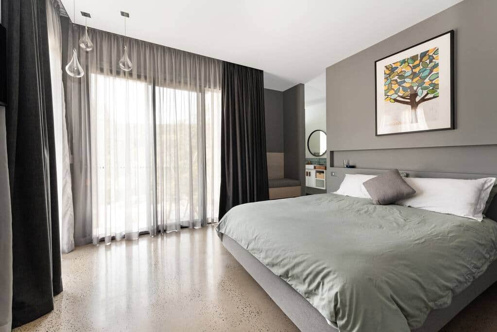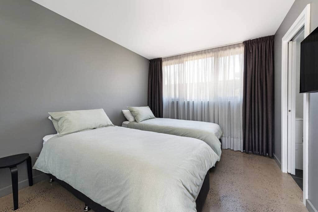 Downstairs hosts a large, light-filled main bedroom with polished concrete floors and Queen-sized bed, smart TV, huge ensuite with shower, heated towel rails, and walk-in wardrobe. The second bedroom includes two single beds, polished concrete floors, smart TV, and ensuite. Other features include free Wi-Fi, double glazing, hydronic heating, laundry with sink, washing machine and dryer, electric BBQ, upstairs powder room, and dedicated study nook.
