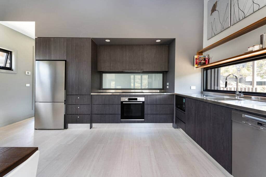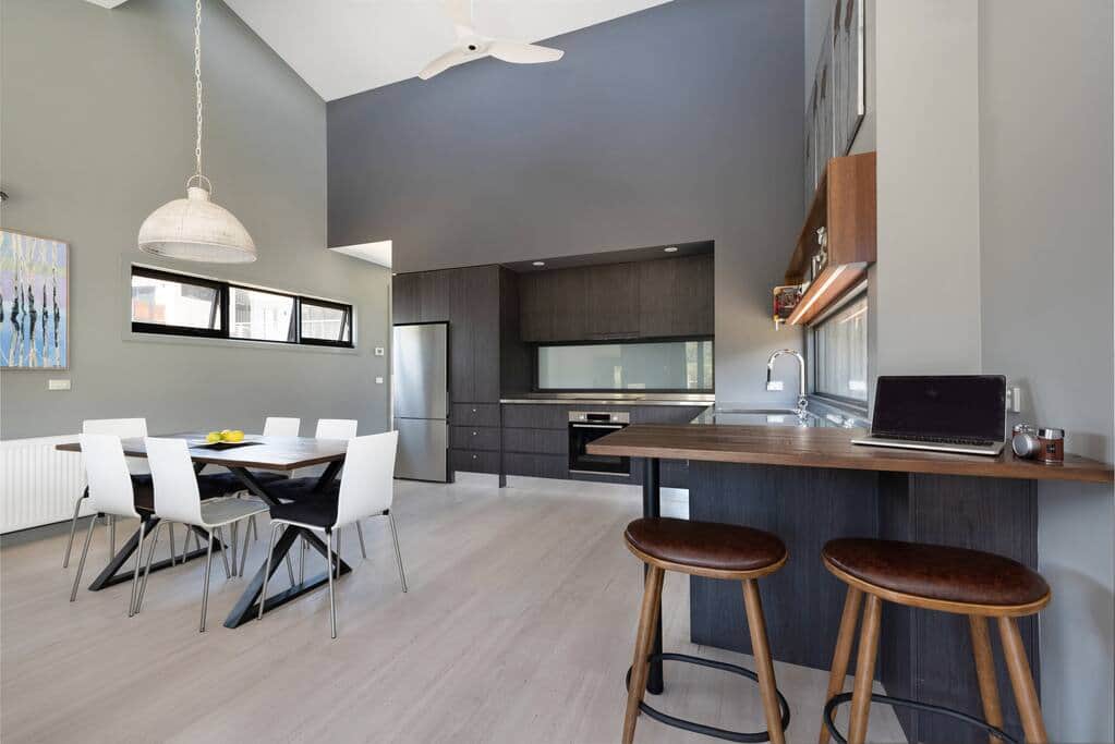 The living area features a vaulted double-height ceiling that brings in a wealth of natural light. The open kitchen has stainless steel benchtops, pantry, ample storage, large fridge, microwave, oven, and induction cooktop, and flows into the dining area with its solid wood dining table.