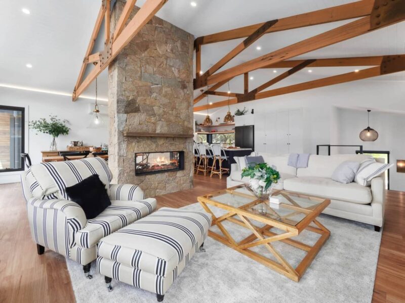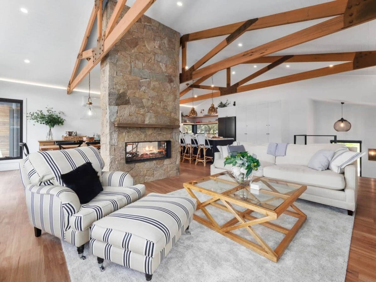 Step into the top floor’s open living space, where vaulted ceilings with striking exposed timber trusses frame the room. At its heart lies a magnificent double-sided stone gas fireplace, perfect for both warmth and ambience. The plush sofa and armchair invite you to unwind while enjoying the 65” smart TV equipped with a soundbar or simply soak in the sweeping views of the lake and Main Range through the expansive picture windows. For ultimate relaxation, a cozy daybed awaits for an afternoon snooze or a moment of quiet contemplation.