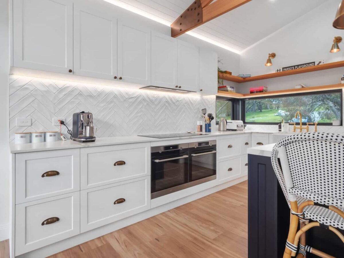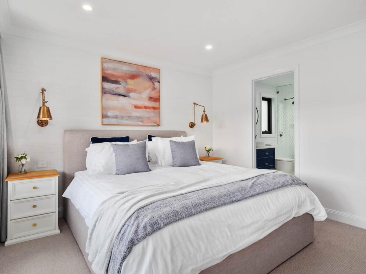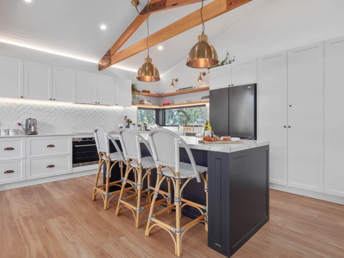The state-of-the-art kitchen is every home chef’s dream, boasting dual ovens, an induction cooktop, a dishwasher, and a French door fridge. A butler’s sink and a well-stocked pantry make meal preparation a joy, while the Nespresso coffee machine ensures your mornings start perfectly. Share meals around the rustic eight-seater timber dining table, which overlooks the sparkling lake, or take your dining alfresco on the north-facing balcony, complete with a gas BBQ and outdoor seating.