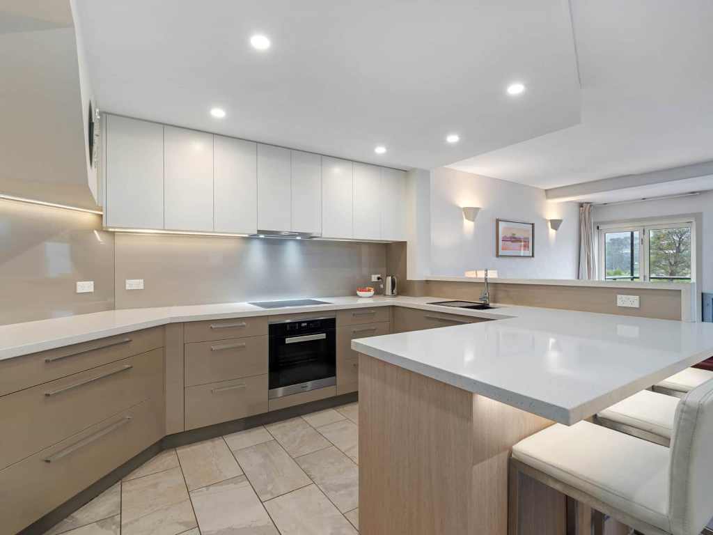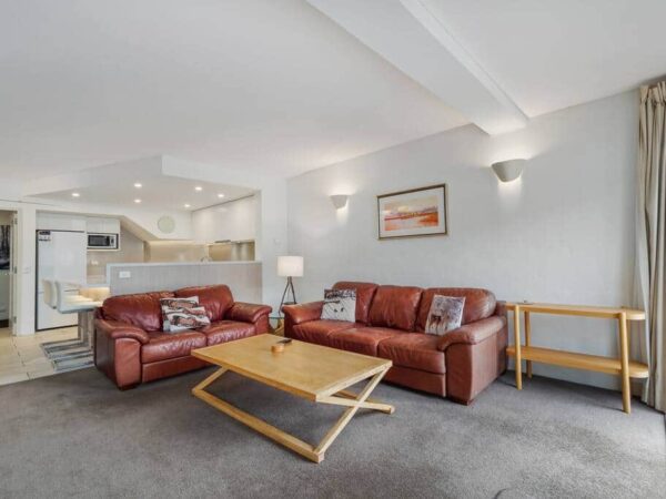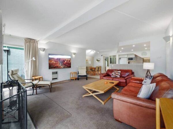 Welcome to Watermark. This three-bedroom apartment is not just next to the water, it’s over it, giving you an unforgettable experience of living on the lake. As you step into the two-level apartment, you’ll be greeted by a spacious open plan living area with a wood^ fireplace that sets the perfect cosy atmosphere for your holiday. But the real showstopper here are the double north facing balconies that offer stunning views of the lake and towards the Main Range.