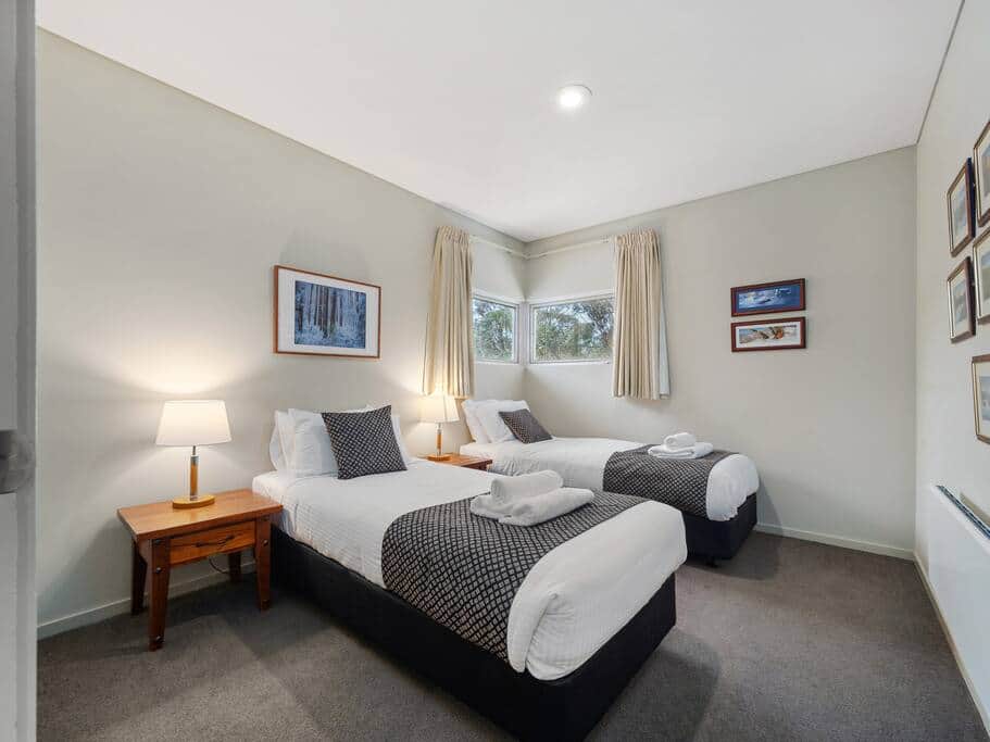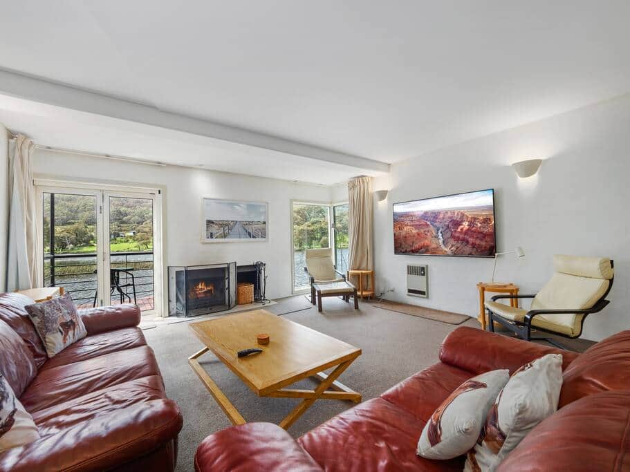 On the ground level, a modern kitchen awaits you with plenty of bench space, Miele appliances, and all the pans, crockery, and utensils you’ll need for cooking up a storm. If you’re in the mood to relax, the comfortable couches are perfect for slumping into while you read, stream something on the smart TV, or just stare at the wood fire or amazing view. But if you’re feeling adventurous, head out to the north-facing balcony and enjoy a drink or look for platypuses in the lake.