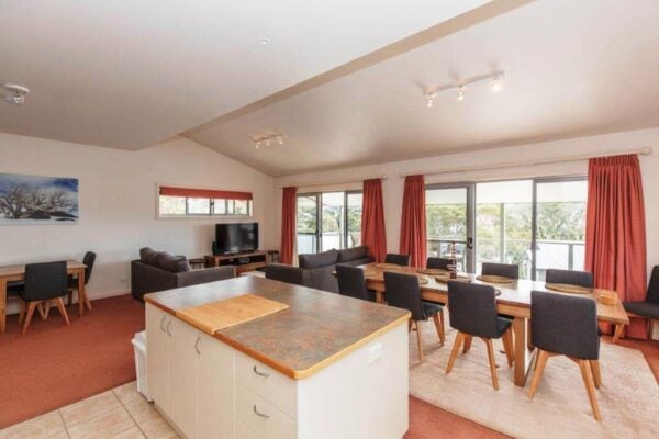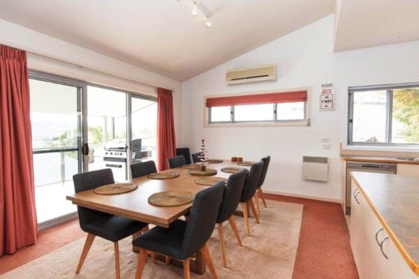 A combined kitchen, dining and living area is the hub in the centre of the property, and with two sliding doors leading out to the full-width balcony you can really create an open and airy space to relax after a long day on the slopes, trails, or lake. Along with the views to the lake and over Jindabyne, it’s a delight to share a drink in the evening while the BBQ sizzles in the background. Other features include reverse-cycle air-conditioning, built-in pantry and wardrobes, and a bath in the upstairs bathroom. The kitchen has all the appliances you’ll expect, including 90cm oven, dishwasher, and microwave.