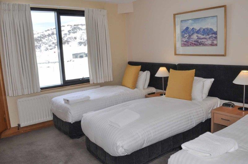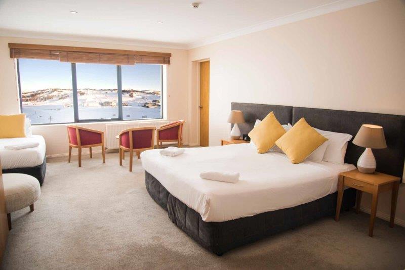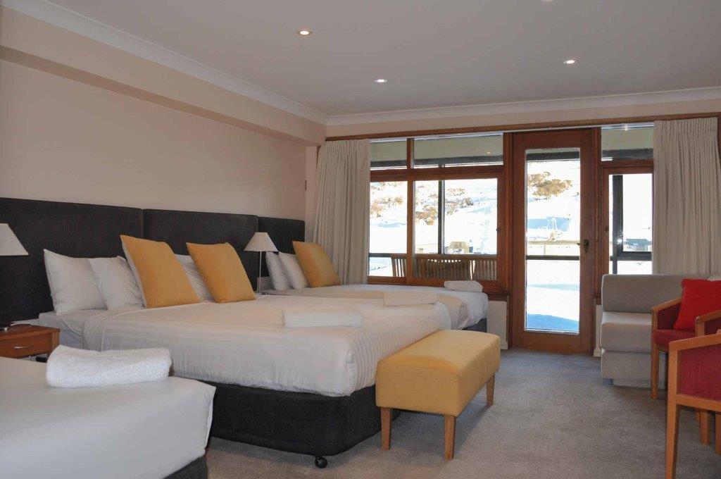 Deluxe Rooms – can accommodate up to 4 guests. These rooms are large single room suites with TV, bar fridge, microwave, tea/coffee making facilities, enclosed balcony overlooking Perisher ski area and ensuite. Bedding configuration: king split bed + 2 single beds