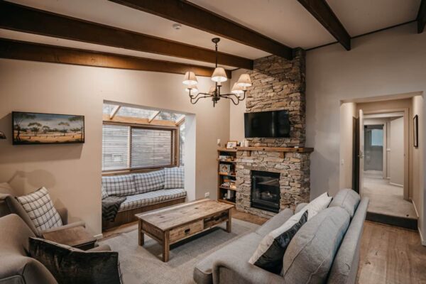 Inside, you’ll find a gourmet kitchen, fully equipped for entertaining, along with a spacious dining area featuring a large table that comfortably seats 12+ guests. Relax by the stone gas fireplace, or step outside to enjoy the outdoor BBQ area. Practical features include a large boot/drying room to keep your ski gear organised, as well as a washer and dryer for added convenience. Outside, there’s plenty of flat bushland where kids can play, and level parking for three cars right at the front door.